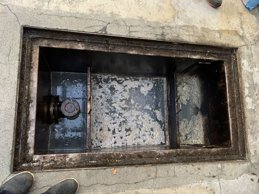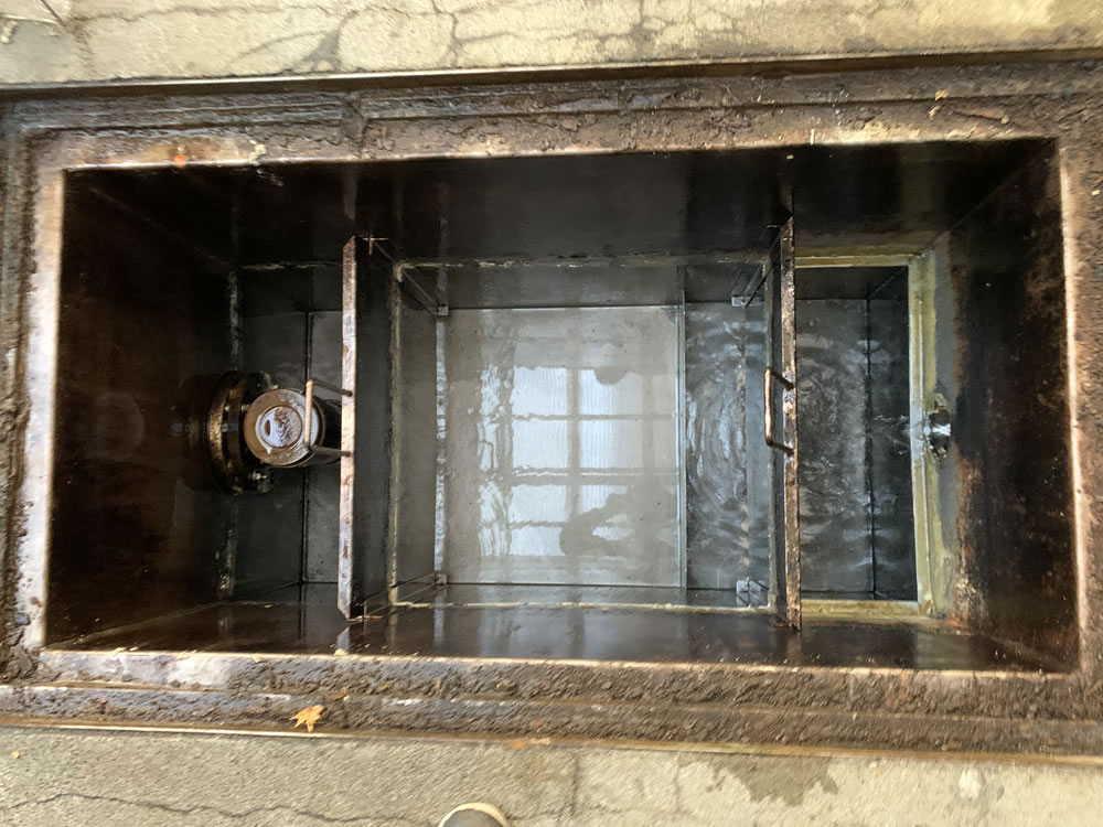 厨房系統の排水口に設置されており、油脂を含む汚水が排水管にそのまま流れ込むことによる配管閉塞を防ぐための設備です。野菜くずや残飯を入口のバスケットで阻集すると共に、水と油の比重差により浮上した油脂分のみを表面に貯める働きをします。