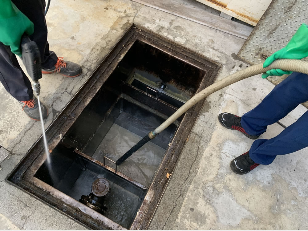 グリストラップは油脂分の比率が多くなると、油水分離が出来ず、排水管に悪影響を及ぼして排水の詰まりを起こすことが多々あります。また、悪臭や害虫が発生することもありますので、定期的に清掃することが大切です。「強力吸引車」を使用して迅速で効率良く作業を進めます。